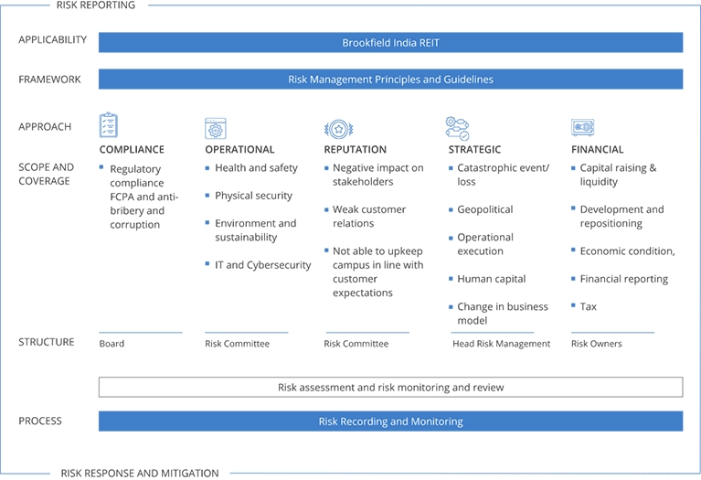 Brookfield India REIT considers effective risk assessments essential for achieving our organizational goals. Identifying risks early on allows us to manage or mitigate them effectively. Our approach to risk assessment spans all aspects of our business, addressing economic, operational, social and environmental risks.