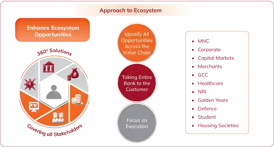 The Bank’s objective is to serve all financial needs of customers and their ecosystems by capturing the entire value chain including their channel partners, dealers, vendors, employees and other stakeholders, by taking the full bank to the customer. In line with the objective of creating customer-oriented ecosystems, the Bank has developed sector-specific solutions. These solutions focus on understanding industry and sector nuances and addressing specific requirements, which help to support businesses at every step of their journey. The Bank has been providing a range of banking services to these ecosystems through a network of physical and digital channels. It provides comprehensive digital solutions for cash management, cross-border/domestic trade and supply chain finance to customers, as well as their employees. These solutions cater to broking, custodian services, real estate, education, FMCG, healthcare, NBFC, pharmaceutical and retail sectors among others.