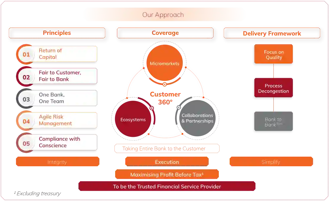 As we mark 70 years of service in fiscal 2025, the Bank progresses on its sustainable growth journey underpinned by disciplined focus on profitable growth, consistent execution, deepening customer-centricity as well as building capabilities. The strategic approach continues to remain anchored on pillars of principles, coverage and delivery framework. The core principles of ‘Return of Capital’, ‘Fair to Customer, Fair to Bank’, ‘One Bank, One Team’ and ‘Compliance with Conscience’, continue to guide our dealings with all stakeholders while pursuing our business objectives.